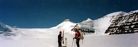 A climber with a the rifle that is among the required expedition gear in Greenland. Polar bears, who are rumored to pursue tracks until their prey has been captured, are a real threat. Directly above the gun is Mount Gunnbjornsfjeld, which at 12,168' is the highest peak on Greenland. (photo: Alpine Ascents Collection)