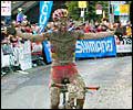 He wasn't alone in his aspirations for the victory, as Thomas Frischknecht (SUI, Ritchey) figured he could get a win in these muddy conditions, as he's the best mud rider in the sport. Frischy went out hard with Filip, and by the mid-way point of the race when heavy rains began to fall, he overtook the lead. These two men were joined from the start by a third, Roel Paulissen (BEL, Team GT) who recently won the Belgian national title. Roel likes to ride in the mud, and has been getting stronger with each race this season as he makes preparations to join fellow Belgian Meirhaeghe at the Olympics. These three built up a two-minute gap on another pair of top racers, world cup leader and current World Champion Miguel Martinez (FRA, Full Dynamix), and 1999 World Champ Michael Rasmussen (DEN, Haro/Lee Dungarees). They rode together in 4th and 5th positions, as Martinez just cruised to ensure the World Cup title while his two closest chasers for the overall Bas Van Dooren (NED, Be-One) and Christophe Dupouey (FRA, Team Giant) rode well out of danger in mid-field. Frischknecht traded the lead with Meirhaeghe several times, even after the Belgian Bomber attacked in the second lap. But in lap three of the five-lap race, Meirhaeghe attacked again, and this time it held. He neutralized Frischy's advantage in the mud as heavy rains turned the muck into a more manageable consistency, and rode off the front, and both left Paulissen two minutes back. In the end it was all Meirhaeghe, who for the first time won two World Cups in a single season, and did it against Frischknecht, the man with destiny on his side. Until this season, Frischy had won at least one World Cup every single season, often in the mud. But he finished 19 seconds away from doing it again, disappointed to break his streak. Paulissen held on for 3rd, while Martinez finished 4th and did indeed win the overall title. Thomas Dietsch (FRA, Bianchi) worked his way up from 10th to 5th, rounding out the podium. His previous-best finish was 33rd, and he's only raced in three World Cups this season. And now all there is to worry about this season is the Olympics, as that's all that the cross-country riders talk about. There will be 30 women and 50 men racing, all of them top World Cup racers and approximately ten of them with the ability to win later this month. And with that in mind, we bid you farewell from the 2000 Tissot-UCI Mountain Bike World Cup. See you next season! Ari Cheren, standing up to his knees in mud yet somehow still standing after 16 rounds of World Cup racing, for MountainZone.com
